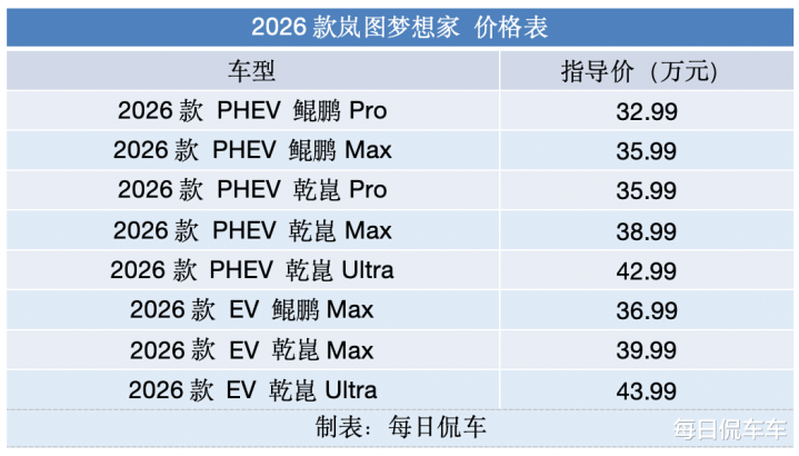 Pro车型与Max车型的主要差异是纯电续航里程,且EV版没有Pro型。PHEV的Pro型CLTC纯电续航是235km,相比Max版是少了些,但在同级其他车型依然有优势。比如腾势D9两驱版车型最长CLTC纯电续航是200km,四驱车型只有190km,别克GL8 PHEV的CLTC纯电续航是202km。具体到车型来看,2026款PHEV 鲲鹏Pro的指导价是32.99万元,相对同价位对手,除了纯电续航更足、动力更强、能耗更低,配置还更足。它提供前排电吸门、AR 后备箱、二排电动隐私帘、前双叉臂后五连杆独立悬架、全铝前后副车架、AI悬浮重力座椅、13L双门智能冷暖箱、17.3英寸后排娱乐屏、29英寸高清AR-HUD等配置,对于预算有限的用户,已经足够满足需求。