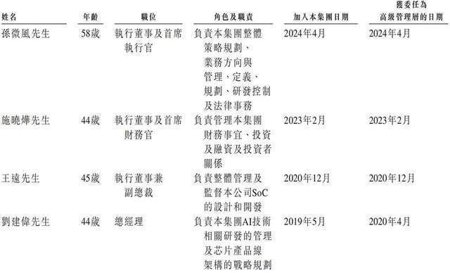 核心高管中,孙微风于2024年2月加入爱芯元智,现担任CEO,今年58岁。