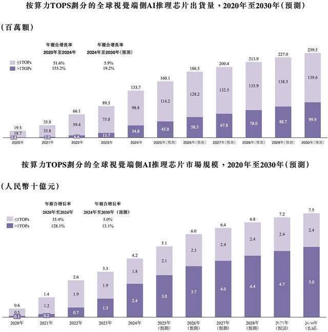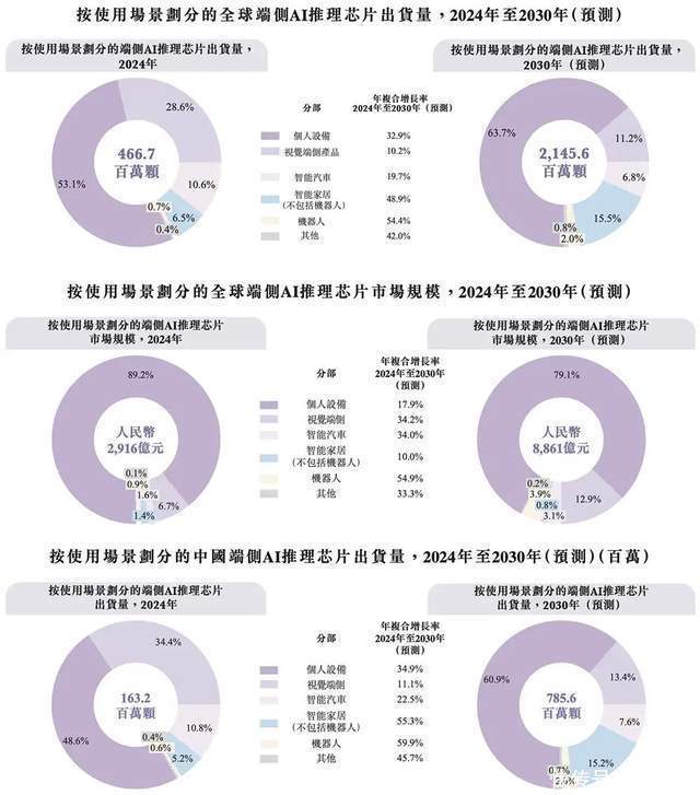 三、累计交付1.65亿颗芯片,智能汽车年收入涨超251%根据招股书,端侧AI推理芯片的应用场景涵盖个人设备、智能汽车、信息系统等领域,这些细分市场预计到2030年将在全球市场实现54.4%、48.9%及19.7%的出货量年复合增长率,在中国市场有望以更高增速发展,分别达到59.9%、55.3%、22.5%。