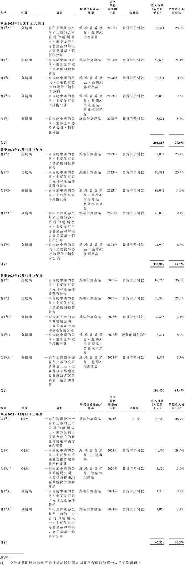 2022年、2023年、2024年、2025年1-9月,前五大客户产生的收入分别占爱芯元智总收入的91.5%、85.4%、75.2%、75.0%。