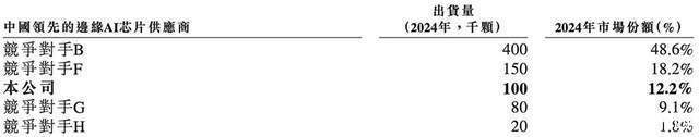 根据灼识咨询的数据,按2024年出货量计,爱芯元智是全球第一大中高端视觉端侧AI推理芯片提供商(市占率为24.1%)、全球第五大视觉端侧AI推理芯片提供商(市占率为6.8%)、中国第二大国产智能驾驶SoC供应商(售出超过51.8万颗智能汽车SoC)、中国第三大边缘AI推理芯片供应商(市占率为12.2%)。