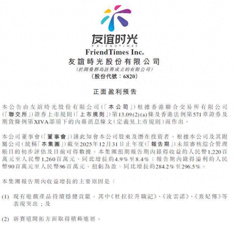友谊时光(6820.HK)于2月11日盘后披露正面盈利预告公告。